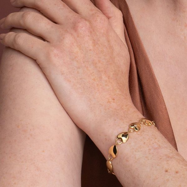 ゴールドプレートのステーションブレスレットには、ミニパドロック(錠前)スタイルのリンクが並び、中央のハートにはクリスタルのディテールが輝きます。調節可能なチェーンで、日常的に簡単に着用でき、毎日身につけたくなる特別な一品です。