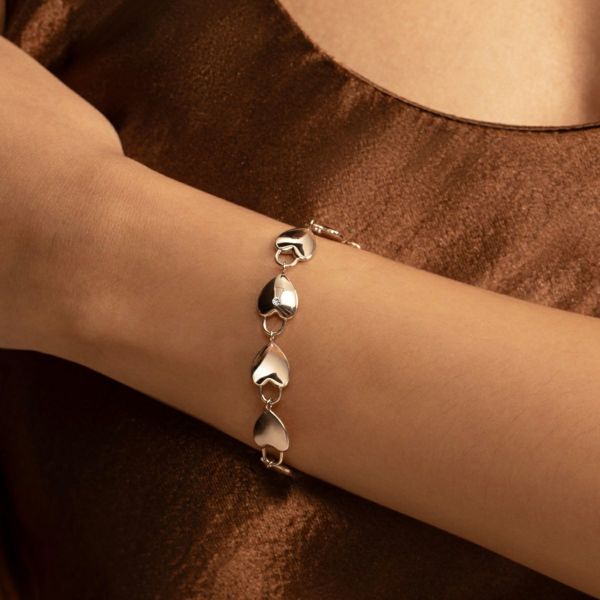 ローズゴールドプレートのステーションブレスレットには、ミニパドロック(錠前)スタイルのリンクが並び、中央のハートにはクリスタルのディテールが輝きます。調節可能なチェーンで、日常的に簡単に着用でき、毎日身につけたくなる特別な一品です。