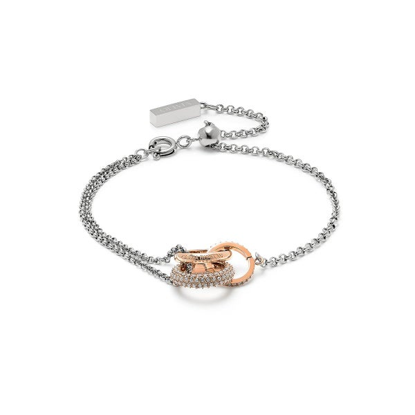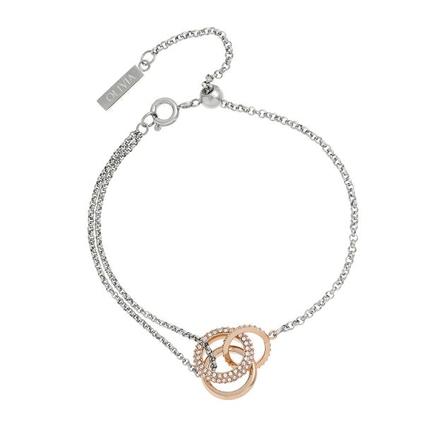 バランス、調和、静寂を象徴する、クラシック・エントワインシリーズのインターリンキング・ブレスレットです。オリビア・バートンのシグネチャーをあしらったローズゴールドプレートのリングと、クリスタルをあしらった2つのサークルが絡み合い、バランス感覚を生み出しています。