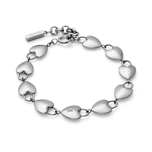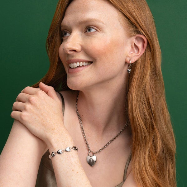 シルバートーンのステーションブレスレットには、ミニパドロック(錠前)スタイルのリンクが連なり、中央のハートにはクリスタルのディテールが輝きます。調節可能なチェーンにより、日常使いしやすく、特別感あふれるアイテムです。
