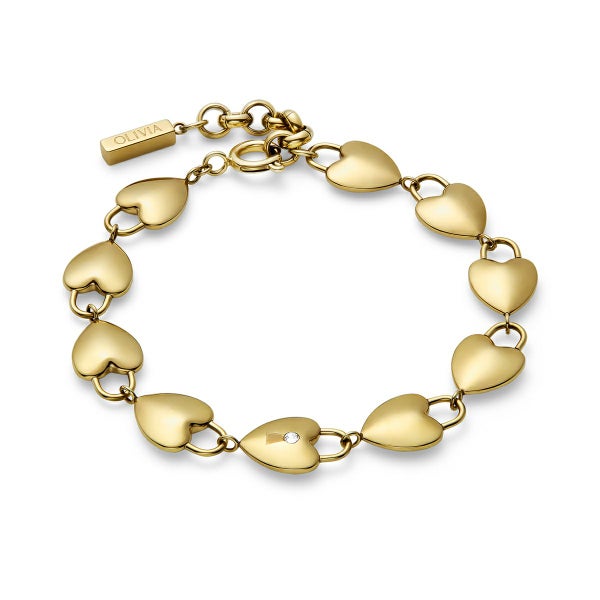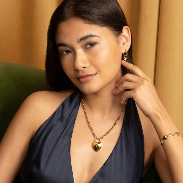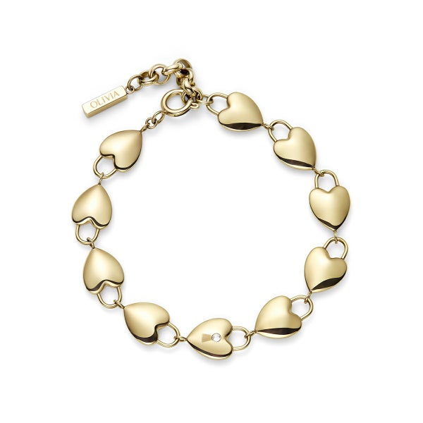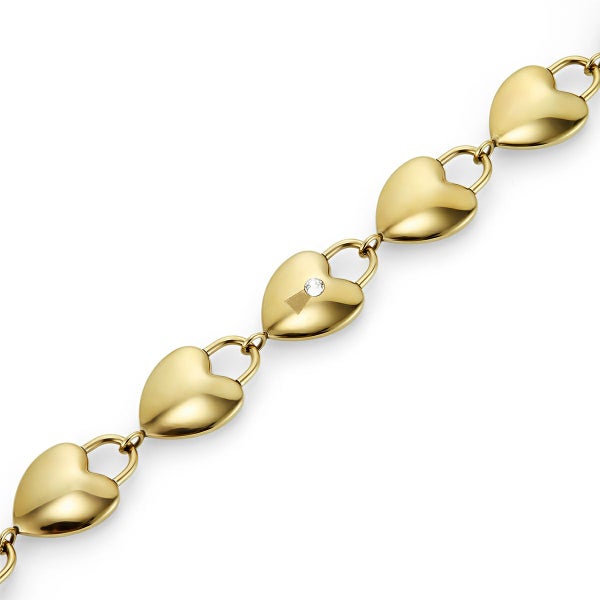 ゴールドプレートのステーションブレスレットには、ミニパドロック(錠前)スタイルのリンクが並び、中央のハートにはクリスタルのディテールが輝きます。調節可能なチェーンで、日常的に簡単に着用でき、毎日身につけたくなる特別な一品です。