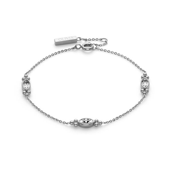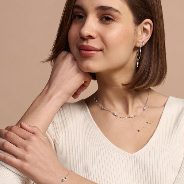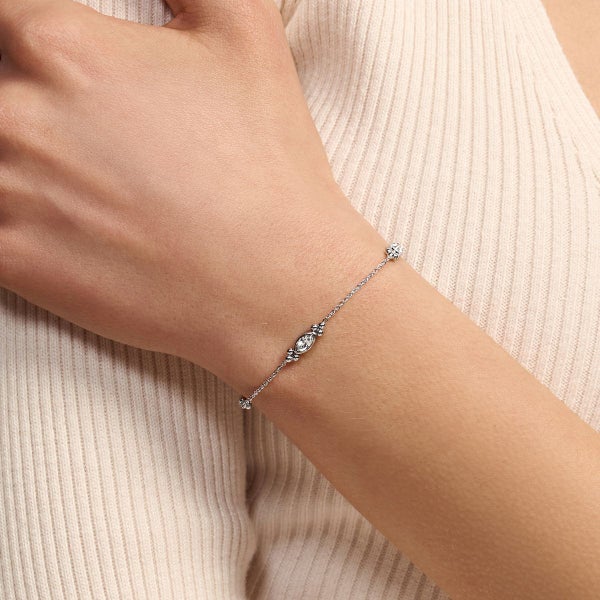 繊細なキャビアビーズとエレガントなマーキスカットクリスタルが組み合わされた、ヴィンテージ風のアクセサリーです。時計とのコーディネートが楽しめる上品な輝きが魅力で、手元に華やかさと品格を添えます。