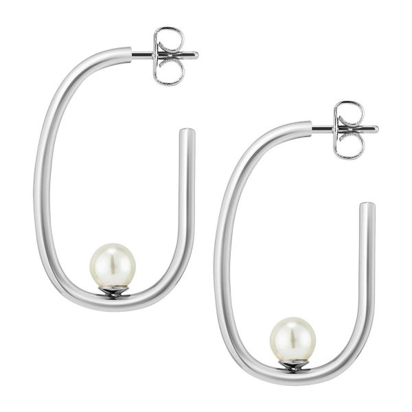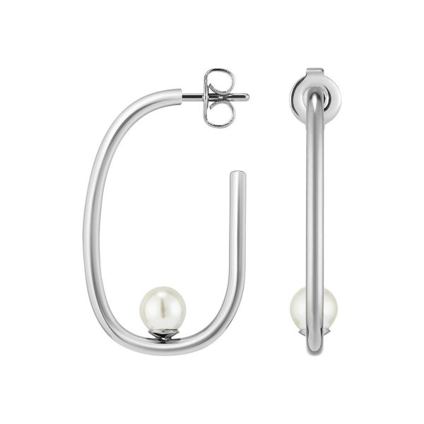 エレガントに弧を描くロングフープに、フェイクパールがそっと寄り添うデザインが目を引くシルバートーンのピアス。動くたびに揺れるパールが、顔まわりに上品な輝きをプラスします。