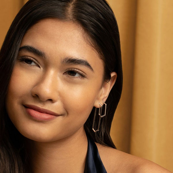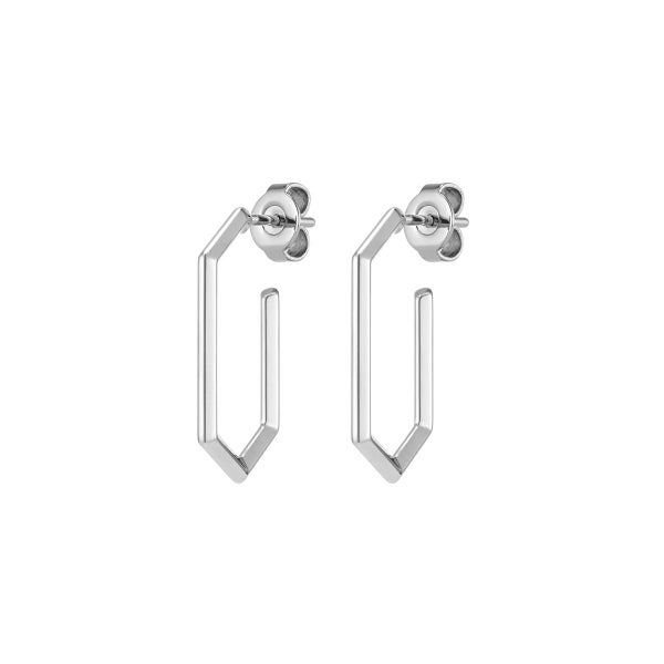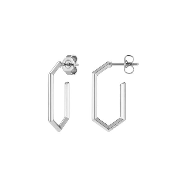 長方形の六角形シルエットが特徴の小さなシルバートーンのフープは、クラシックなスタイルに新たなひねりを加えたデザインです。