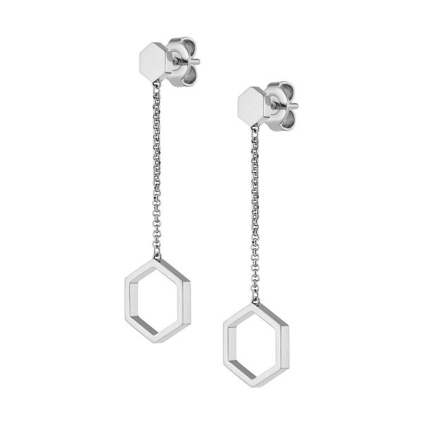 繊細なチェーンと六角スタッドから、オープンヘキサゴンがゆらめくシルバートーンのドロップピアス。