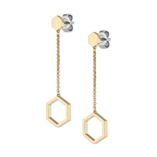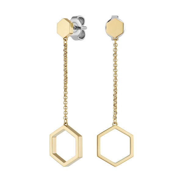 繊細なチェーンと六角スタッドから、オープンヘキサゴンがゆらめくゴールドトーンのドロップピアス。