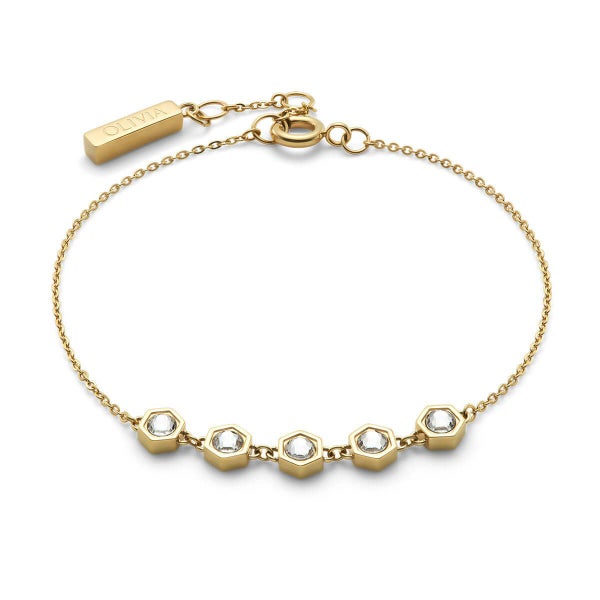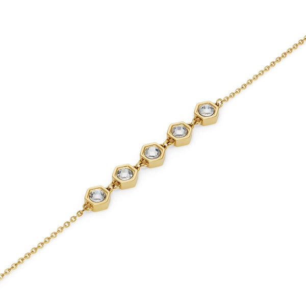 繊細な六角形チャームにクリスタルをあしらい、蜂の巣の美しい規則性からインスパイアされたデザインに。