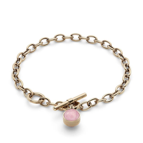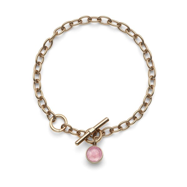 愛と癒しの石として親しまれるローズクォーツを、やわらかなカボションカットでセットしたTバー・トグルブレスレット。