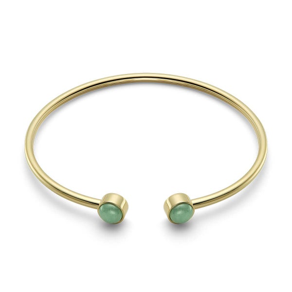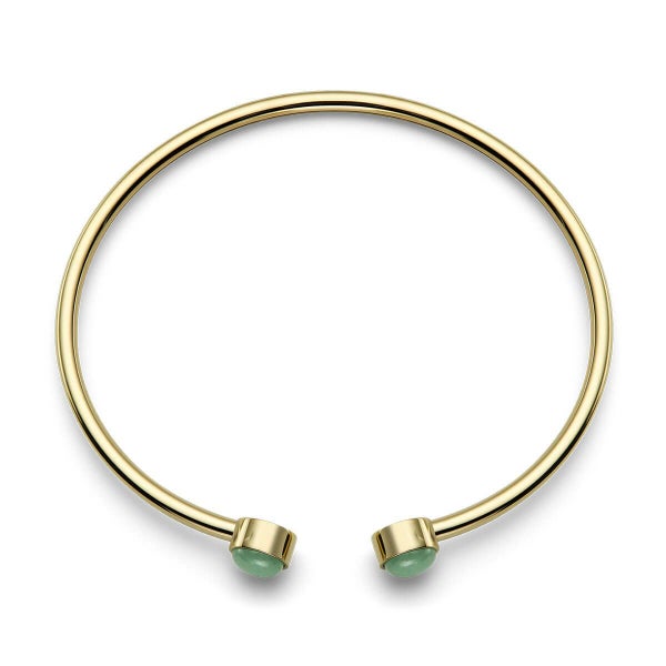 ゴールドプレーテッドのバングルの両端には、艶やかなカボションカットの天然石が2石セットされ、手元に洗練された彩りを添えます。