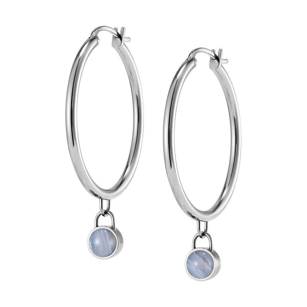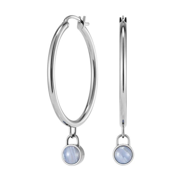 深みあるパープルアゲートのパワーを感じて。磨き上げられたカボションカットのアゲートストーンをあしらった、存在感のあるシルバートーンのフープピアスです。