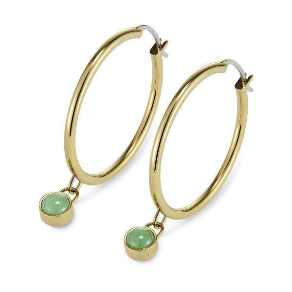磨き上げられたカボションカットのグリーンアベンチュリンが、ゴールドプレートのフープに映える華やかなピアス。存在感のあるデザインながら、上品で洗練された印象を与えてくれます。