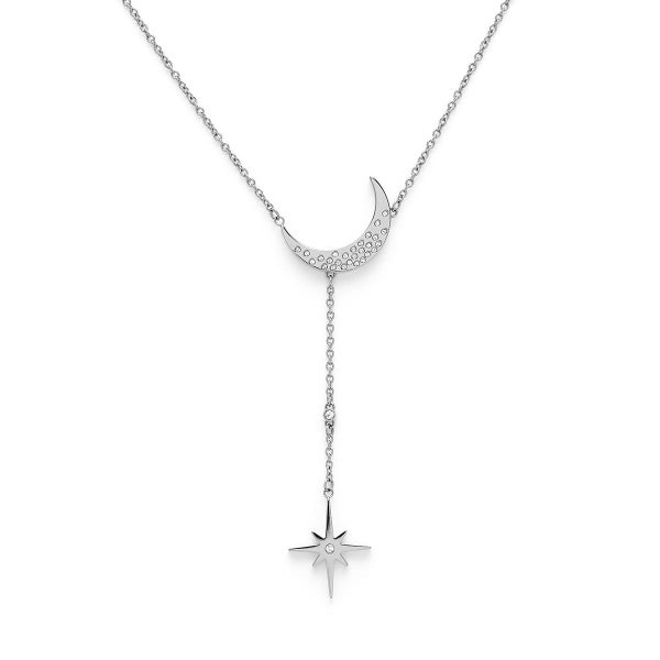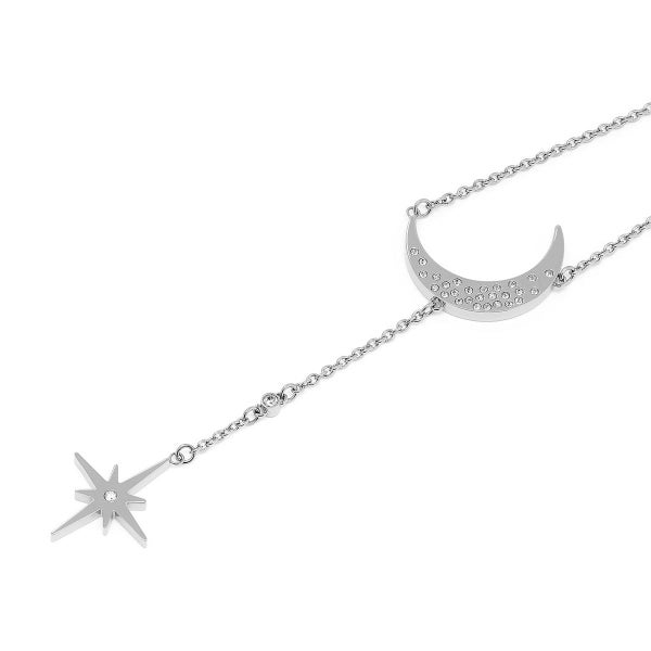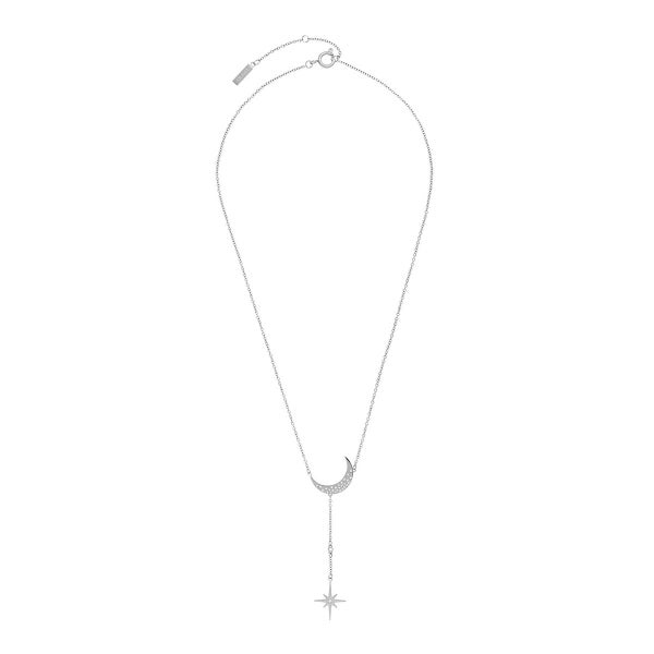 宇宙の神秘にインスパイアされた「セレスティアル ノーススター&ムーン ネックレス」です。ステンレススチールのラリエットチェーンに、キュービックジルコニアをあしらった三日月のチャームと北極星のペンダントがエレガントな印象を与えてくれます。月をモチーフにしたこのスタイルは、私たちを取り巻く世界とのつながりを示すお守りとして身につけましょう。