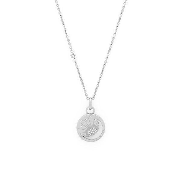 美しい天体をテーマにしたペンダントは、細部までこだわった光線が放射される特別な太陽の出現を表現しています。くり抜かれた三日月とクリスタルの星が飾られ、昼から夜までの空の美しさを演出しています。繊細なチェーンが使われ、小さな星のディテールが施されています。洗練された、輝くスタイルを演出します。