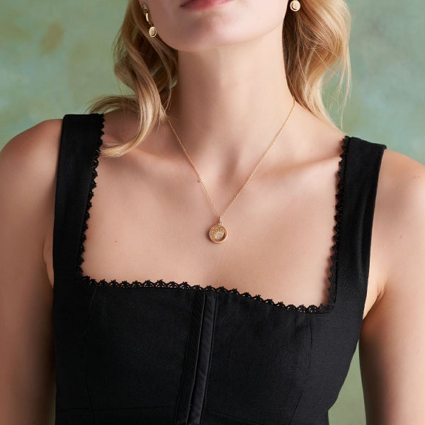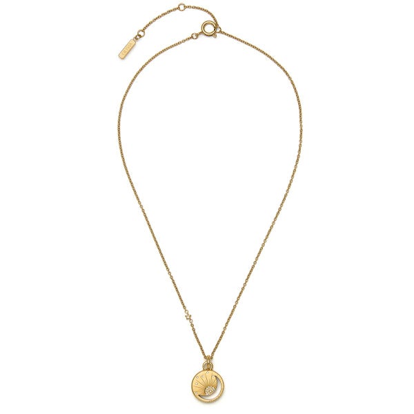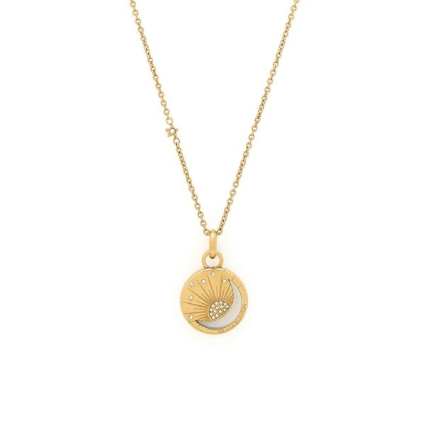 美しい天体をテーマにしたペンダントは、細部までこだわった光線が放射される特別な太陽の出現を表現しています。くり抜かれた三日月とクリスタルの星が飾られ、昼から夜までの空の美しさを演出しています。繊細なチェーンが使われ、小さな星のディテールが施されています。洗練された、輝くスタイルを演出します。