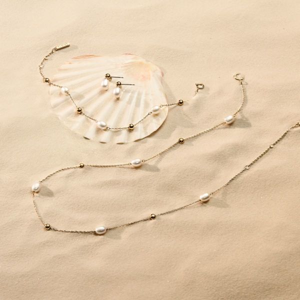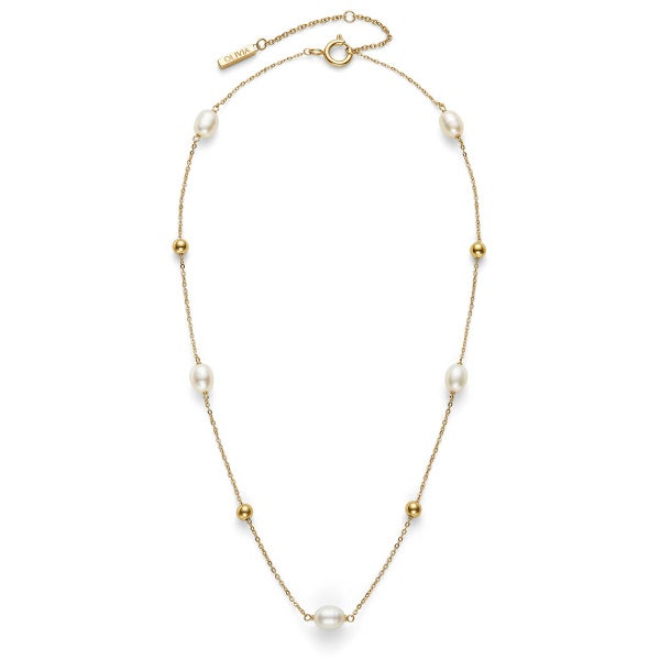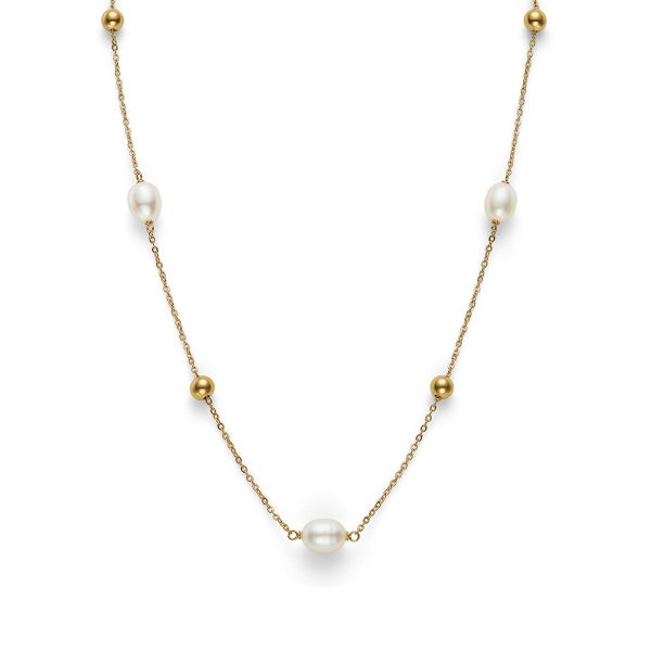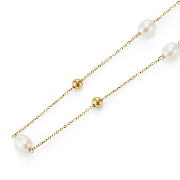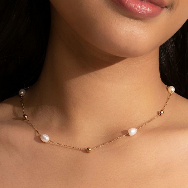 水中の美しさを捉えるために、見事な淡水真珠をお楽しみください。このステーションネックレスには、それぞれが美しくユニークな5つの真珠が特徴です。滑らかなゴールドコーティングのビーズと交互に配置され、繊細なゴールドコーティングのチェーンで仕上げられたこのネックレスは、独特の自然なひねりを加えたエレガンスを演出します。