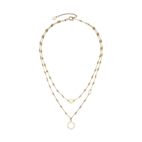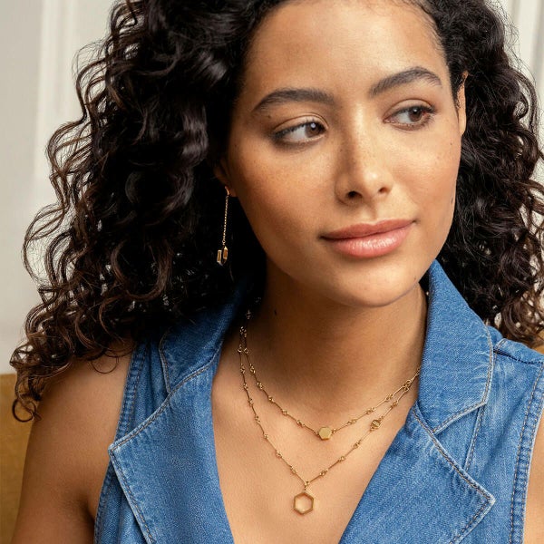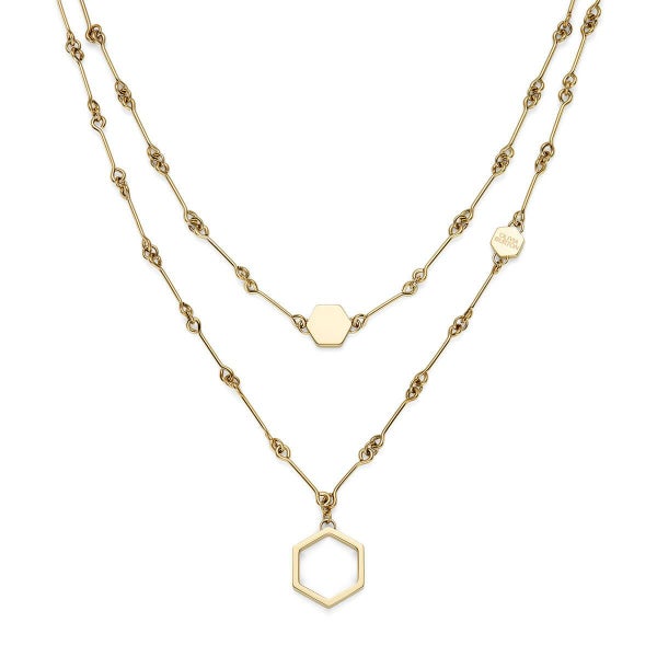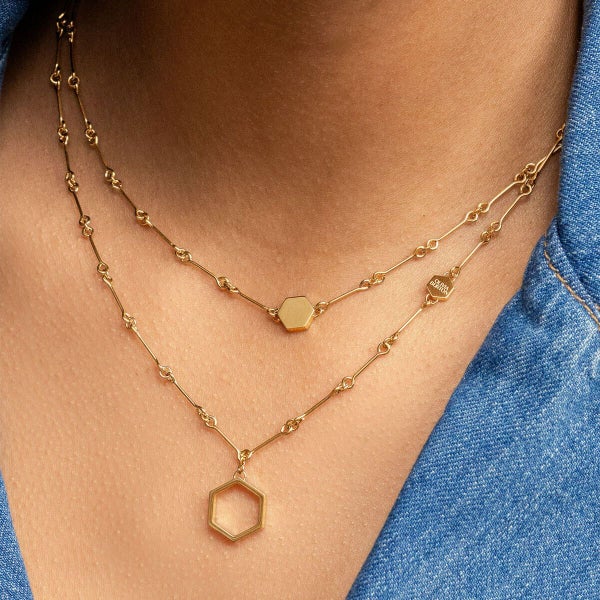 アイコニックなハニカムモチーフに、ヴィンテージ感漂うバーリンクチェーンを合わせた2連ネックレス。ショートチョーカーとロングペンダントの絶妙レイヤードで、ひとつで華やかさも抜群。オープン型の六角形チャームに揺れるミニチャームが、どの角度から見ても視線を奪います。