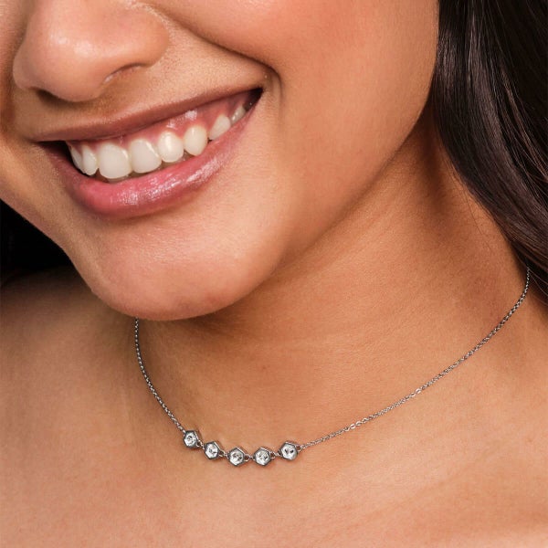 人気のモチーフから着想を得た「Ever Stacked」コレクションに、ハニカムを思わせる六角形のクリスタルチャームが並ぶシルバートーンネックレスが仲間入り。