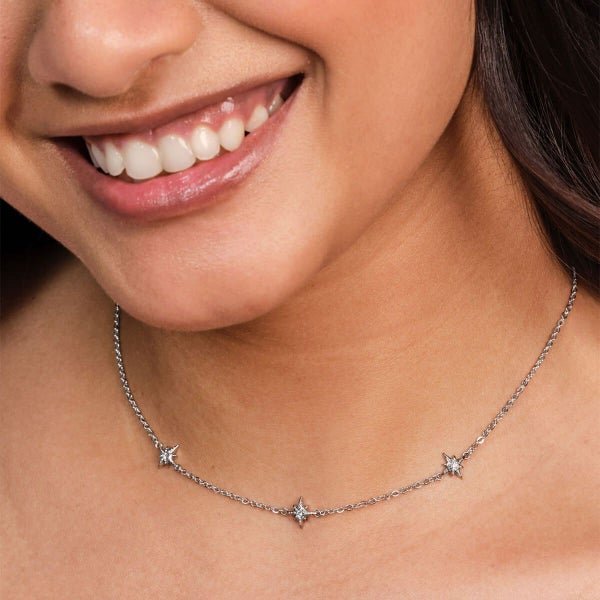 繊細に輝くクリスタルをあしらったノーススター(北極星)チャームが、静かに存在感を放ちます。ゆったりとしたエクステンダー付きで、お好みの重ね付けスタイルも自在に。