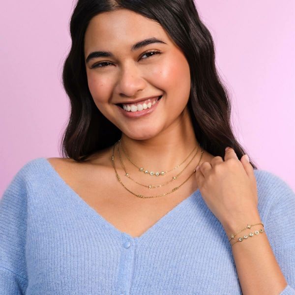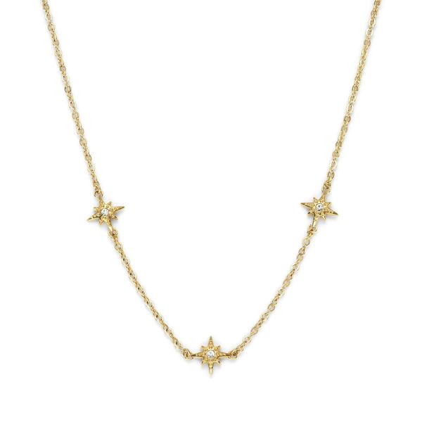 繊細なクリスタルをあしらったノーススター(北極星)チャームが連なり、胸元に上品な輝きを添えます。ゆったりとしたエクステンダー付きで、重ね付けも自在にアレンジ可能。