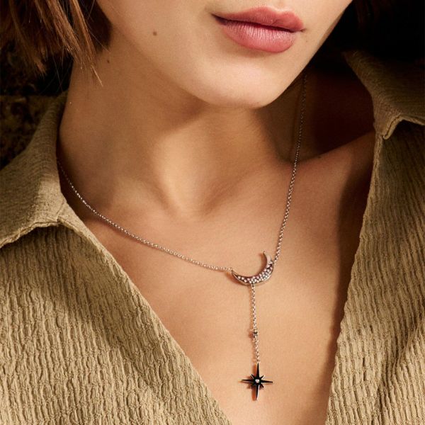 宇宙の神秘にインスパイアされた「セレスティアル ノーススター&ムーン ネックレス」です。ステンレススチールのラリエットチェーンに、キュービックジルコニアをあしらった三日月のチャームと北極星のペンダントがエレガントな印象を与えてくれます。月をモチーフにしたこのスタイルは、私たちを取り巻く世界とのつながりを示すお守りとして身につけましょう。