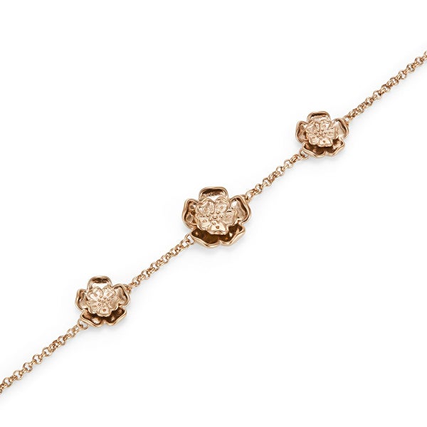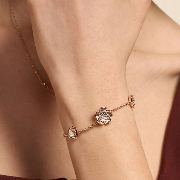英国の伝統的な紋章からインスパイアされた繊細な花のモチーフが印象的な「チューダー・ローズ」コレクション。3輪のチューダー・ローズが手元を華やかに演出するブレスレットは、肌に美しく映えるデザイン。シンプルながらも存在感があり、他のアクセサリーとも相性抜群です。