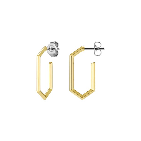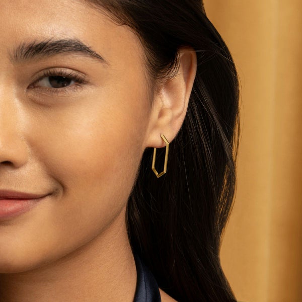 長方形の六角形シルエットが特徴の小さなゴールドプレートのフープは、クラシックなスタイルに新たなひねりを加えたデザインです。