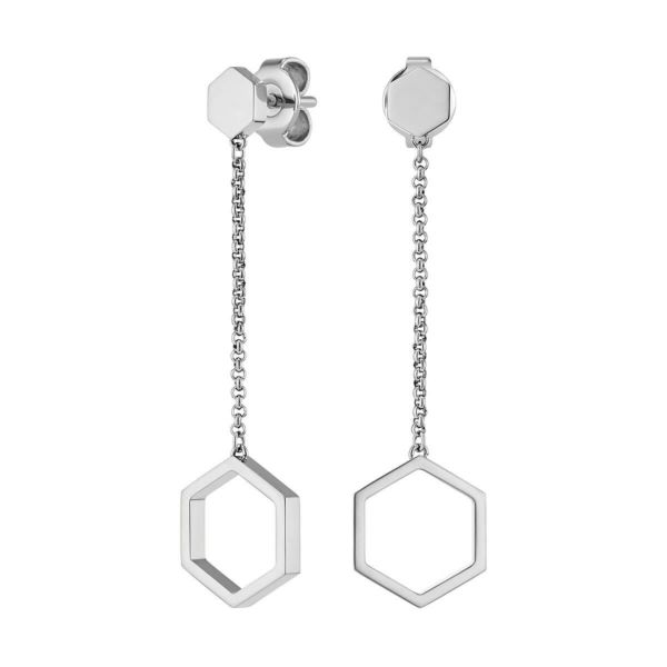 繊細なチェーンと六角スタッドから、オープンヘキサゴンがゆらめくシルバートーンのドロップピアス。