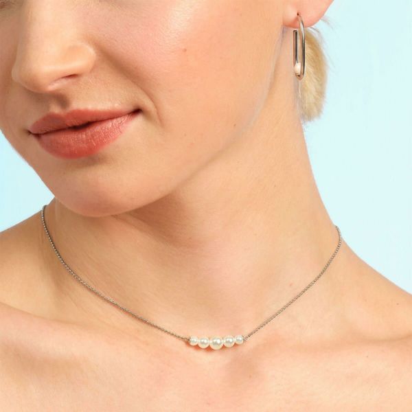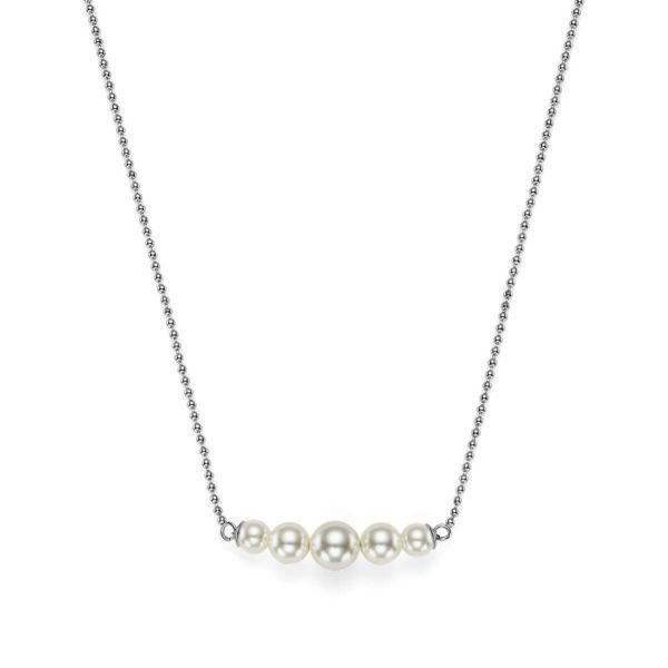 シルバートーンのチェーンに、グラデーションが美しいフェイクパールとメタルビーズを組み合わせた、洗練されたネックレス。パールの上品さはそのままに、さりげないメタルビーズがアクセントになり、ひと味違う表情をプラスします。ほかのネックレスとの重ね付けもおすすめで、夏の装いをぐっと華やかに演出してくれる一本です。