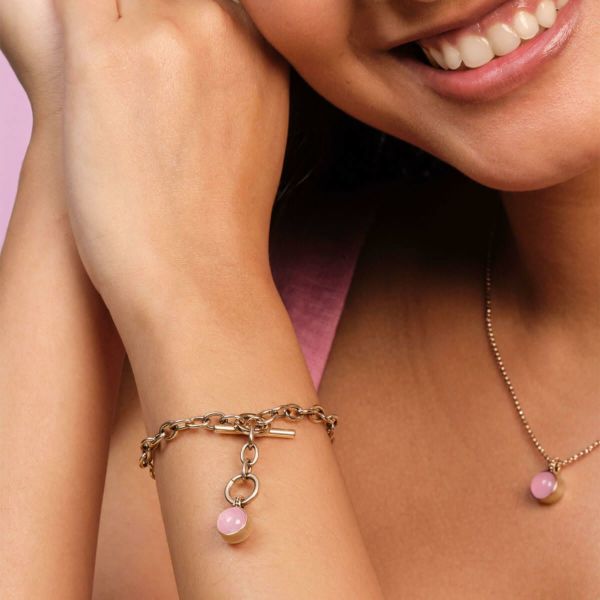 愛と癒しの石として親しまれるローズクォーツを、やわらかなカボションカットでセットしたTバー・トグルブレスレット。