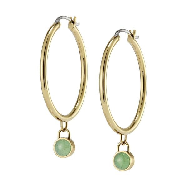 磨き上げられたカボションカットのグリーンアベンチュリンが、ゴールドプレートのフープに映える華やかなピアス。存在感のあるデザインながら、上品で洗練された印象を与えてくれます。