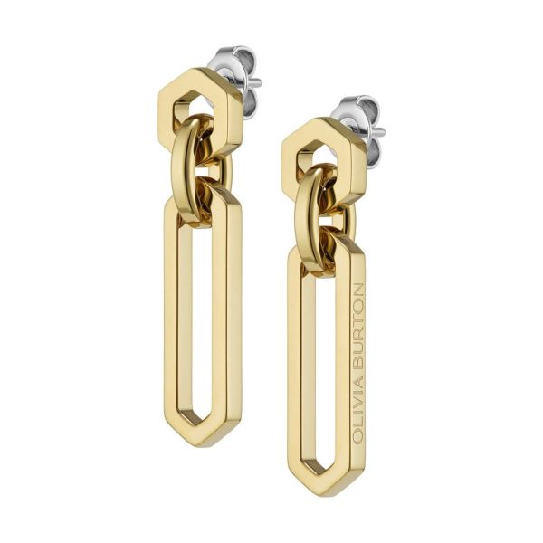 蜂の巣をモチーフにした六角形のスタッドと、繊細に重なり合うリンクが美しく揺れるドロップピアス。