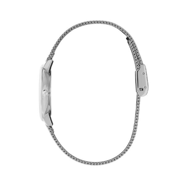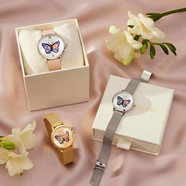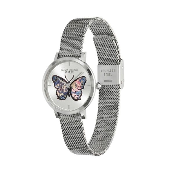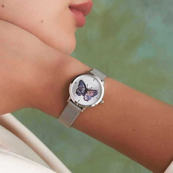 ヴィンテージプリントをイメージしたカラフルな模様の羽を持つ蝶が、その美しさは28mmのシルバーのサンレイ文字盤に見事に表現されています。超薄型ケースとメッシュストラップが、この腕時計を完璧に仕上げています。