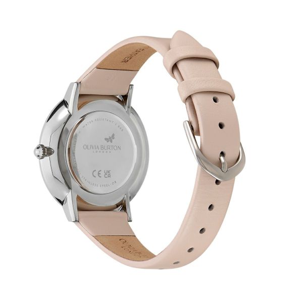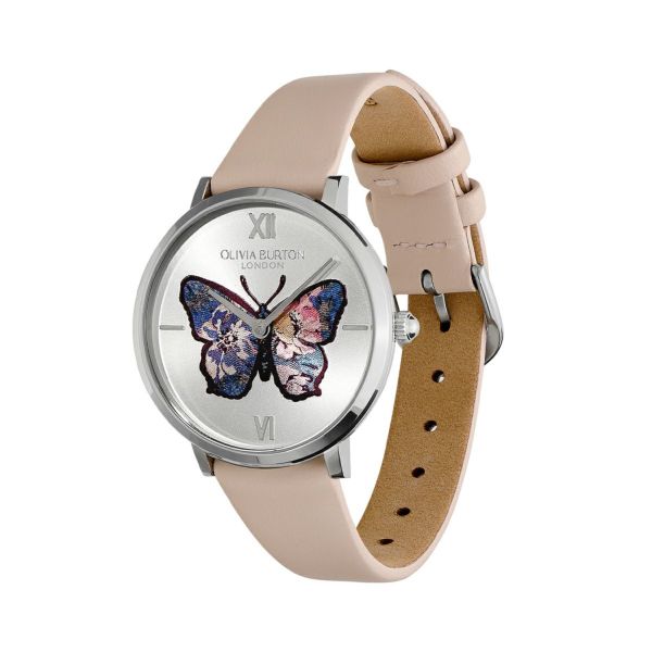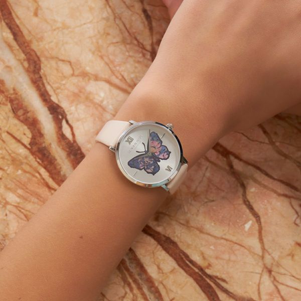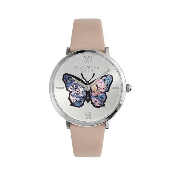 ヴィンテージプリントをイメージしたカラフルな模様の羽を持つ蝶が、シルバーのサンレイ文字盤を舞台に、飛翔しています。シルバー仕上げの超薄型ケースとエレガントなヌードカラーのレザーストラップが、この腕時計を完璧に仕上げています。