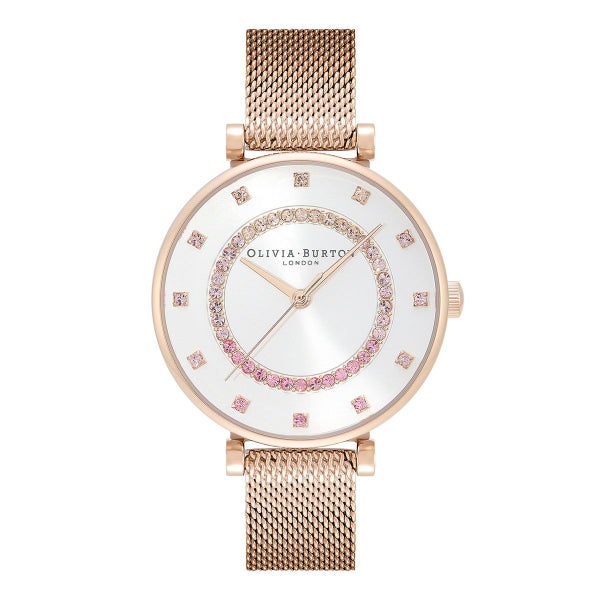 ロンドンのシックな街、ベルグラビアにインスパイアされたモデルです。サンレイダイヤルに同系色のオンブレイクリスタルをあしらい、トラッキングとマーカーを配置したクールで洗練されたデザインです。カーネーションゴールドのメッシュストラップが添えられ、ラグジュアリーな雰囲気を醸し出しています。