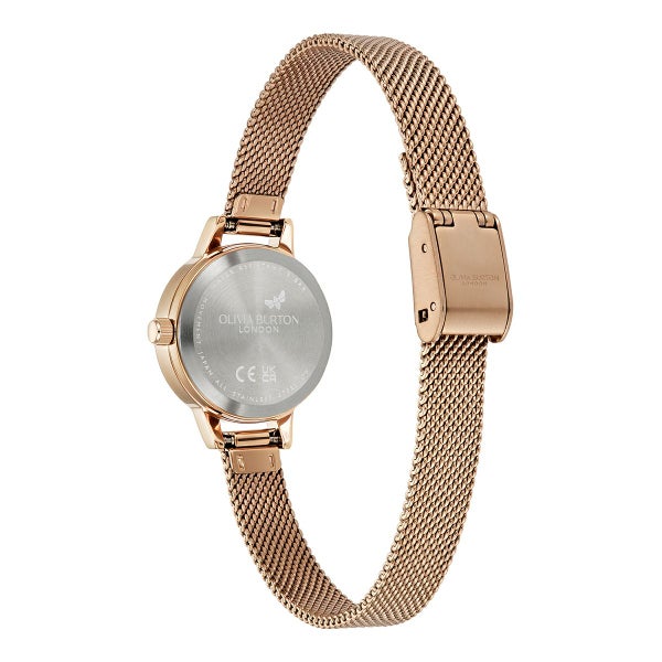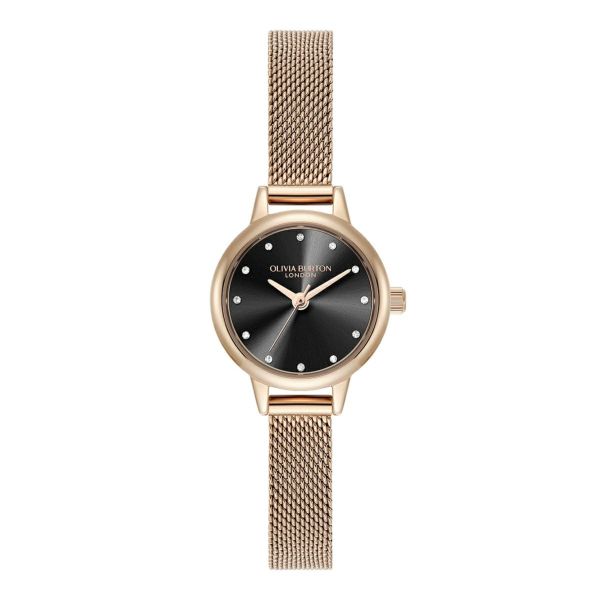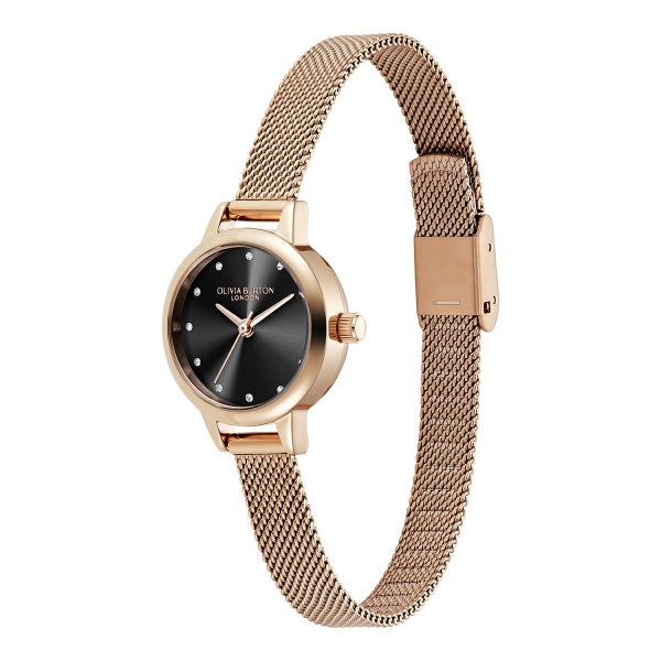 繊細なダイヤルには、輝くブラックサンレイ仕上げとクリスタルマーカーが施されています。シンプルで洗練されたケースとメッシュブレスレットストラップは、華やかなローズゴールドトーンで仕上げられ、小さなサイズながらも大きな存在感を放ちます。
