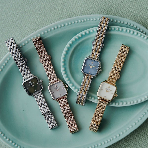ベストセラー Grosvenor が、ミニサイズの20mmスクエアダイヤルで登場。タイニーながらも、ノーススターとクリスタルマーカーが繊細な輝きを放つ、エレガントなデザイン。
