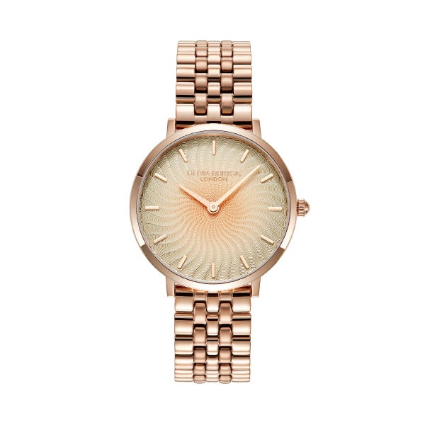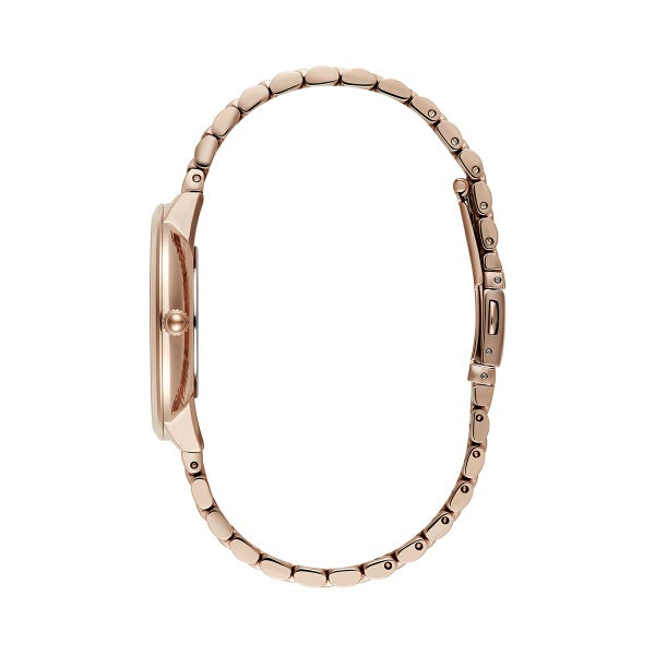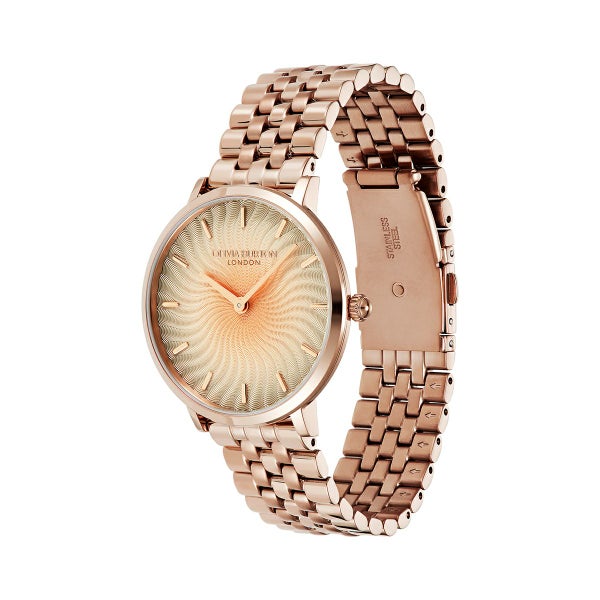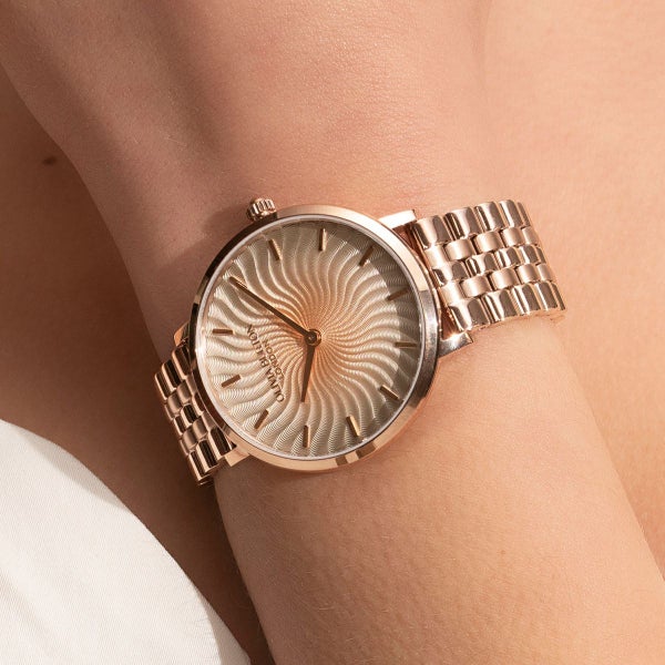 ラディアントサンウォッチで、魅力的な輝きを手に入れましょう。太陽の光線からインスピレーションを受けた、今流行の『波』のプリントが、輝くメタリックで他に類を見ないデザインです。テクスチャーのある太陽光線のダイヤルには、ウェーブ状の光線が描かれ、さりげないオンブレ効果が楽しめます。スリムなケースとクラシックな5リンクブレスレットストラップで仕上げられた、魅力的で遊び心溢れるコンテンポラリースタイル。