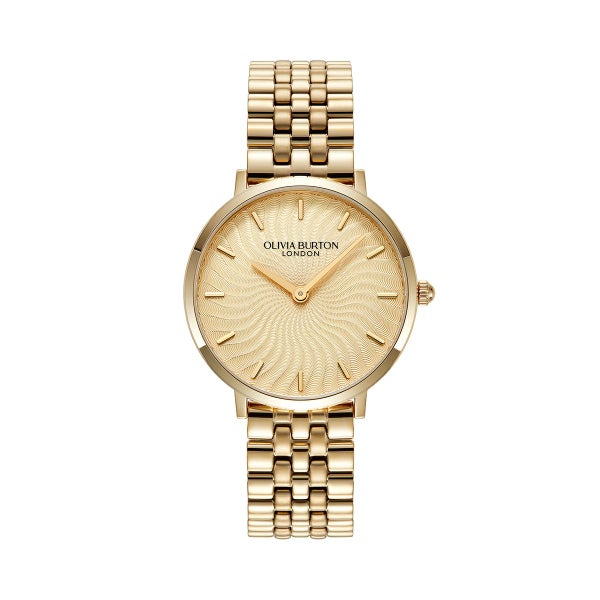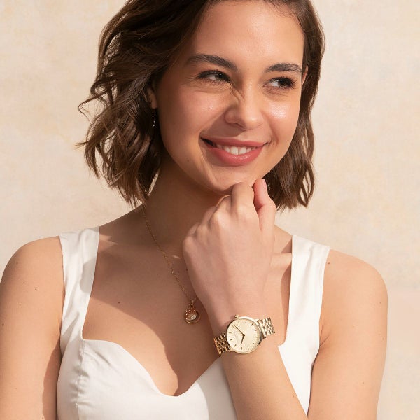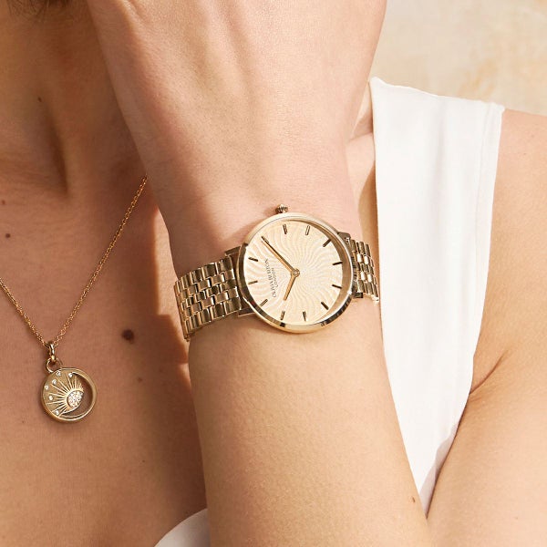 ラディアントサンウォッチで、魅力的な輝きを手に入れましょう。太陽の光線からインスピレーションを受けた、今流行の『波』のプリントが、輝くメタリックで他に類を見ないデザインです。テクスチャーのある太陽光線のダイヤルには、ウェーブ状の光線が描かれ、さりげないオンブレ効果が楽しめます。スリムなケースとクラシックな5リンクブレスレットストラップで仕上げられた、魅力的で遊び心溢れるコンテンポラリースタイル。
