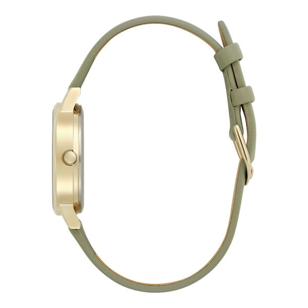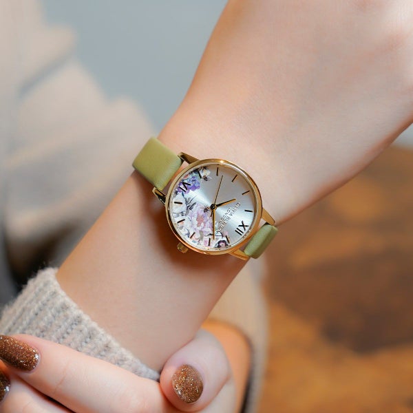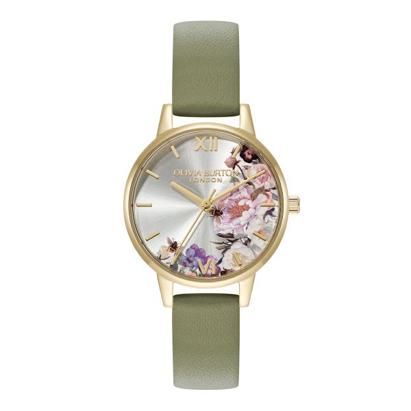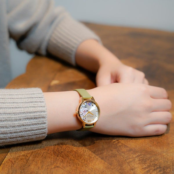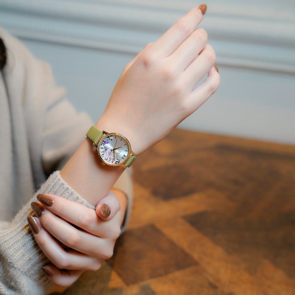 イギリスの田園風景を思わせるクラシックなフローラルデザインが特徴。色とりどりの花々と、その周りを飛び回るミツバチが描かれたダイヤルに、セージグリーンのレザーストラップとゴールドケースが調和し、クラシカルな印象を与えます。落ち着いた華やかさが手元を美しく引き立てる一本です。