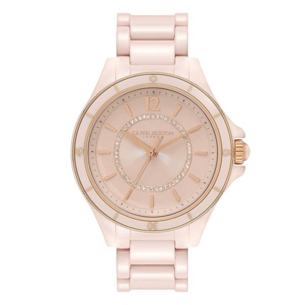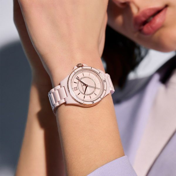 ブランド初の高い耐久性を持つセラミックをケースとストラップに採用したハイエンドモデル。36mmの文字盤には繊細なエッチング加工が施され、クリスタルのラインストーンをセット。ベゼルの12時位置には、ハチの巣をモチーフにした愛らしい六角形のデザイン、リューズトップのカラーマーカーや着脱しやすいバタフライバックルなど、スポーティーなシルエットを上品にアレンジしたモデル。