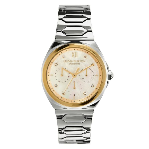 このエレガントなスポーツラグジュアリーのデザインは、曲線を際立たせています。柔らかくドーム状になったケースが、エーテリアルなホワイトマザーオブパールにゴールドのアクセントとクリスタルのマーカーが施されたマルチファンクションダイアルを美しく取り囲んでいます。新しいブレスレットストラップは、オリビア・バートンのお気に入りからインスパイアされたもので、ハニカムのデザインが特徴です。六角形のリンクが、スポーティーなシルバー仕上げに遊び心を添え、このウォッチに独自の魅力を与えています。