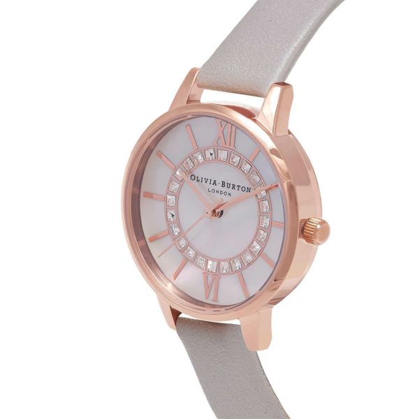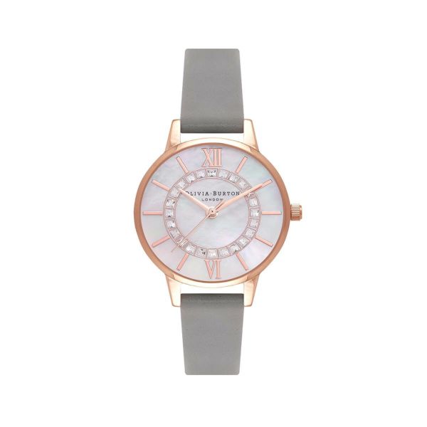 ブランドの定番コレクション、ワンダーランドに新作が登場。きらめくホワイトのマザーオブパールの文字盤に、クリスタルが優しく輝きます。ローズゴールドの針とインデックスに加え、柔らかなグレーのレザーのベルトで、毎日使える上品なアイテムと言えるでしょう。