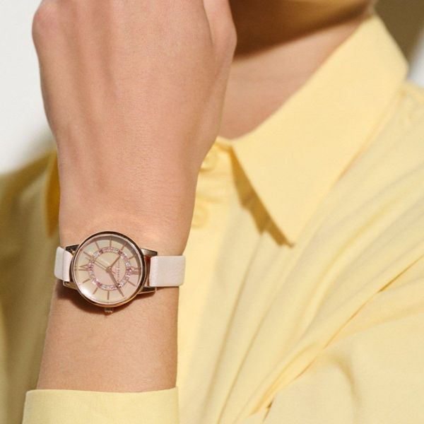 ブランドの定番コレクション、ワンダーランドに新作が登場。ローズカラーのマザーオブパールの文字盤に、淡いピンクグラデーションのクリスタルを贅沢にあしらい、きらめくパールのストラップを合わせました。ロマンティックなこの一本は、ピンク好きのあなたに。