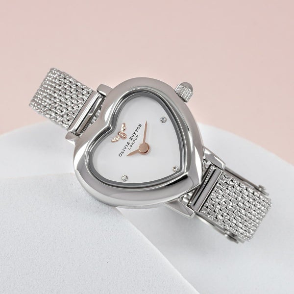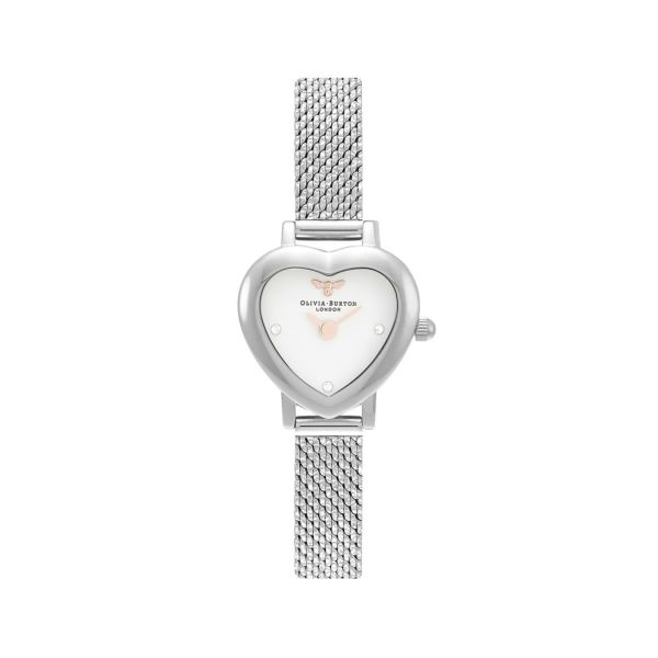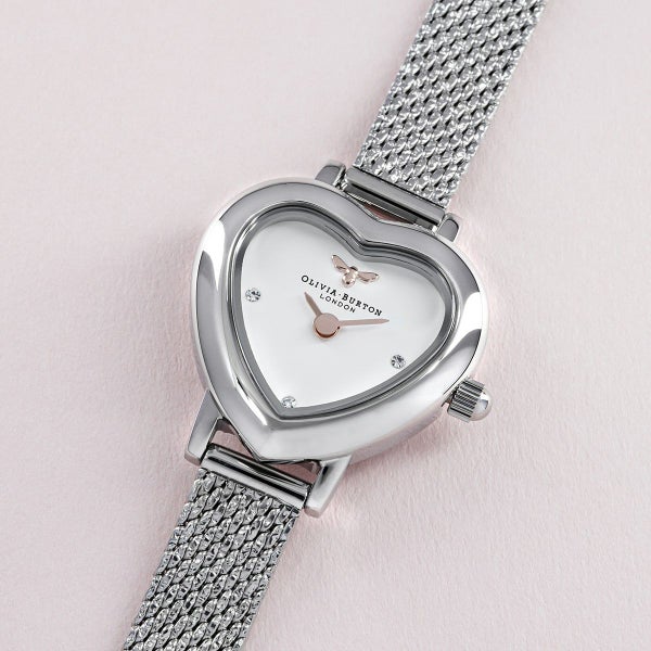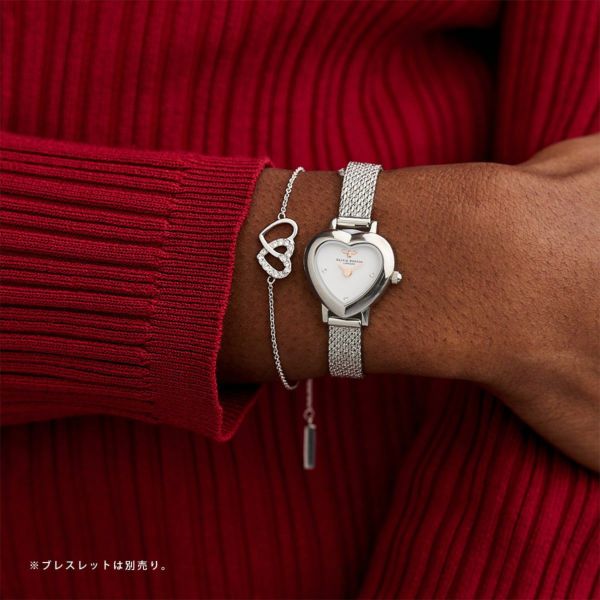 腕元の小さな宝物。ヴィンテージ風のハート型の小さなケースに、ホワイト文字盤と小さなミツバチのモチーフを閉じ込めて、シルバーカラーのメッシュベルトを合わせました。「運命の愛(Mean to be)」と「ミツバチ(Bee)」の意味を込めた新作コレクションです。バレンタインやホワイトデーのギフトとしても、自分へのご褒美としても、「大切にしています」というメッセージを実感できるアイテムです。