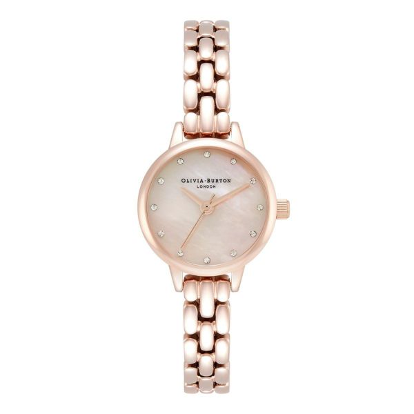 ブラッシュカラーのマザーオブパールの文字盤に、魅惑的なクリスタルのマーカーを配した上品で繊細なモデル。ポップな色使いと優しい輝きを楽しんでいただける1本でしょう。