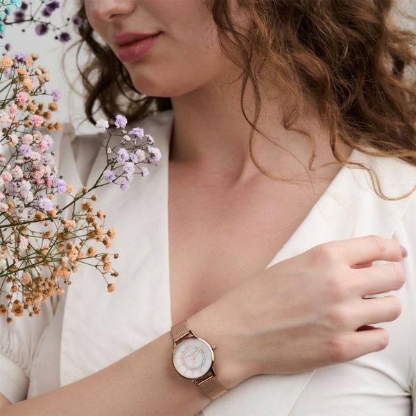 オリビア・バートンで愛されている二つのコレクション、レインボーとワンダーランドが融合した、最高に素敵な時計ができました。微かにきらめくマザーオブパールの文字盤が、華やかなレインボーカラーのクリスタルで際立ちます。シンプルなローズゴールドメッシュのストラップで、ラグジュアリーかつスタイリッシュな一本に。このスタイリッシュなアイテムが「あなたの毎日に彩りと輝きを添えますように」と込められてます。