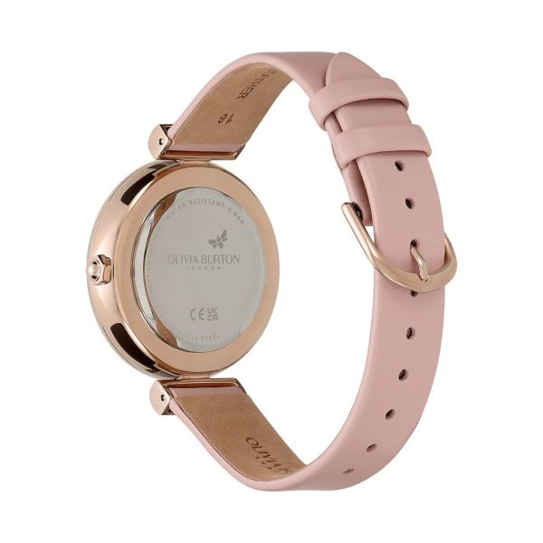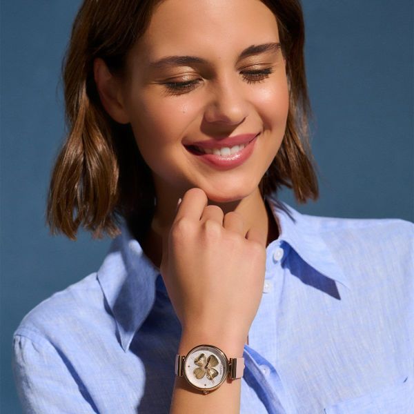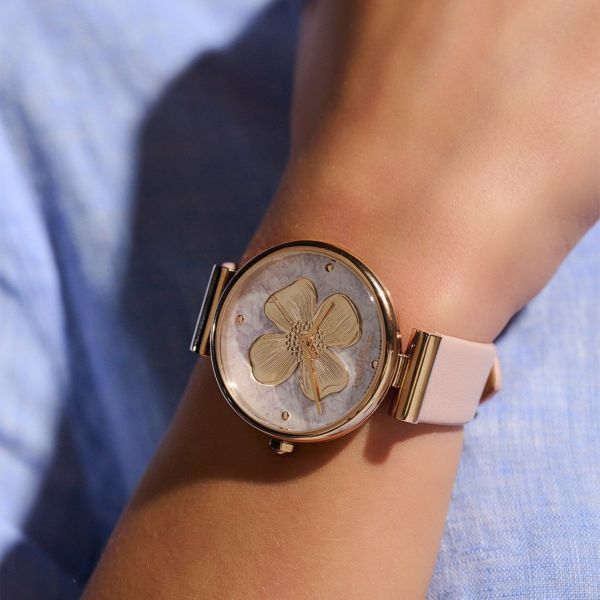 英国の田園地帯にインスパイアされ、美しいワイルドドッグウッドの花を私たちのシグネチャーTバーに飾りました。洗練されたローズゴールドプレートのケースと花柄のダイアルに囲まれ、立体感ある花が完璧な中心になっています。柔らかいブラッシュカラーのレザーストラップと組み合わせ、日常の装いにぴったりの一品に仕上げました。