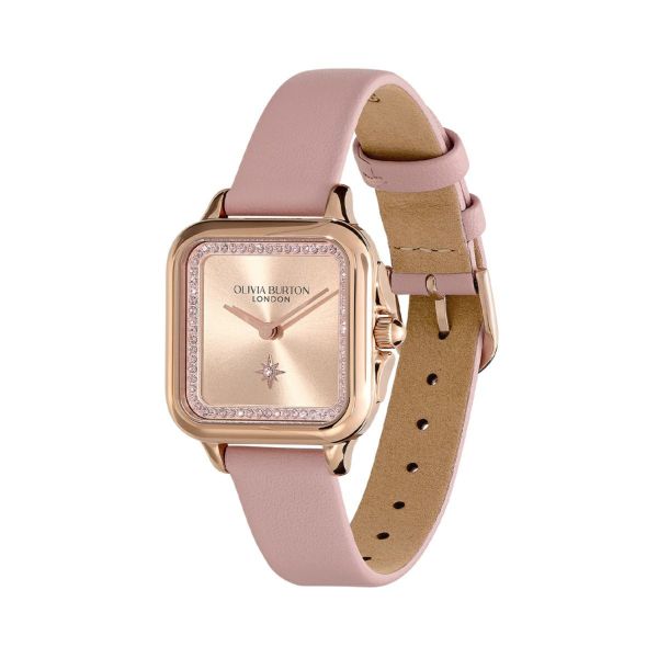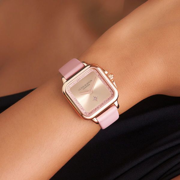ロンドンの歴史的な通りや広場からインスピレーションを受けた、柔らかな角型文字盤のグローブナー腕時計。華やかなブラッシュクリスタルのベゼルとメロウローズの柔らかなレザーストラップが特徴です。