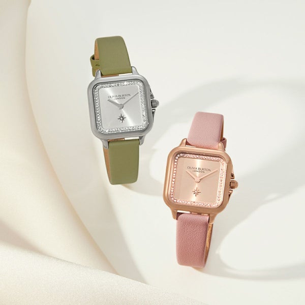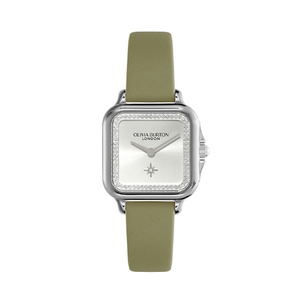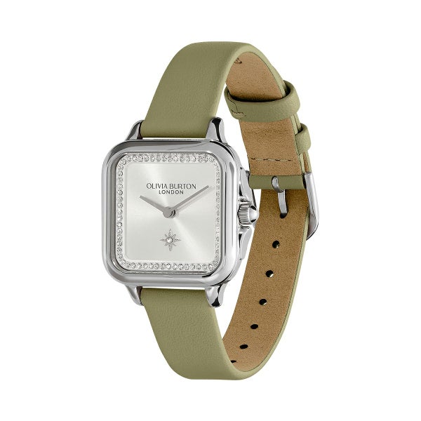 ロンドンの歴史ある通りや広場からインスピレーションを得たグローブナー腕時計は、柔らかな角型文字盤に華やかなクリスタルのベゼルとセージグリーンの柔らかなレザーストラップが施されています。