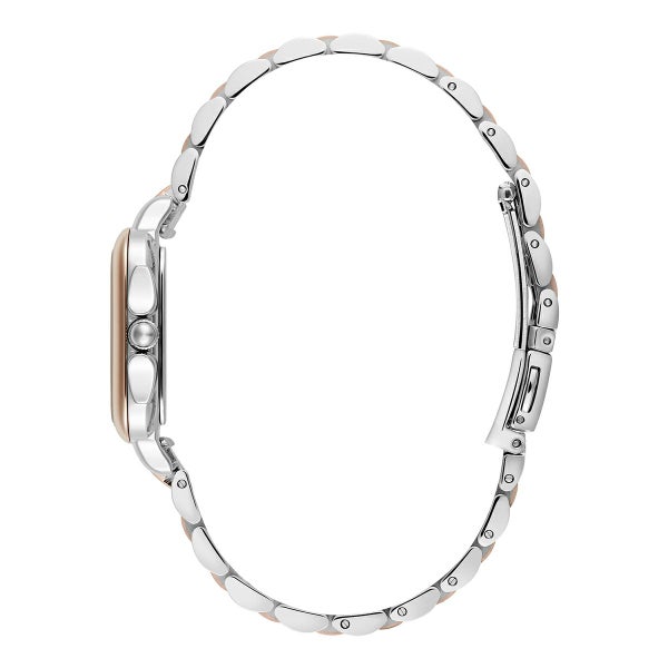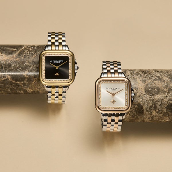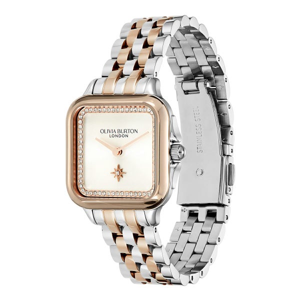 「グロブナー」は、エレガントなクリスタルガラスが敷き詰められた文字盤と、丸みを帯びたソフトスクエアケースが特徴の腕時計です。12時位置にブランドロゴ、6時位置に北極星モチーフのマーカーのみを配置したミニマルなダイアルデザインが目を引きます。2トーンのブレスレットストラップでまとめられ、ロンドンの洗練されたスタイルを表現しています。